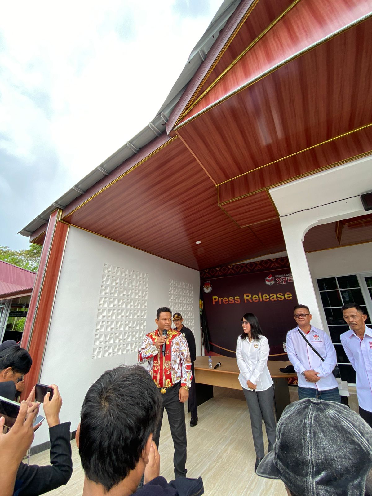 Pasangan bakal calon Bupati dan Wakil Bupati Kabupaten Bangka, Dr. Andi Kusuma, S.H., MKn., CTL., dan Budiyono, S.H., menyampaikan pernyataan sikap di Kantor Komisi Pemilihan Umum (KPU) Kabupaten Bangka, Rabu (14/5/2025).
