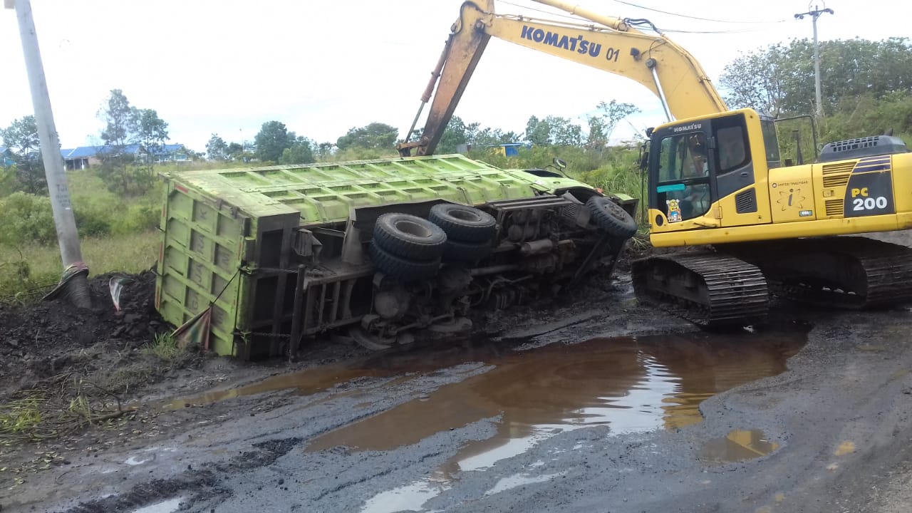 Armada Muatan Batu Bara Terbalik Menimpa Tiang Listrik Warga Resa