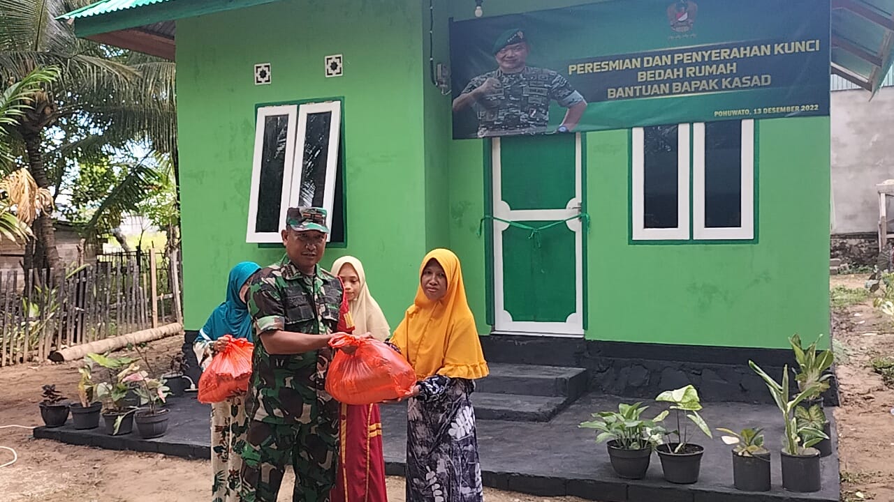 Selain peresmian RTLH, melalui Dandim 1313/Pohuwato TNI AD juga memberikan bantuan paket sembako berupa Beras 5 Kg, Gula 1 Kg , Minyak Goreng 1 Liter, Sarden 3 Kaleng dan Indomie 3 Bungkus, dengan harapan bisa membantu pencukupan kebutuhan masyarakat.