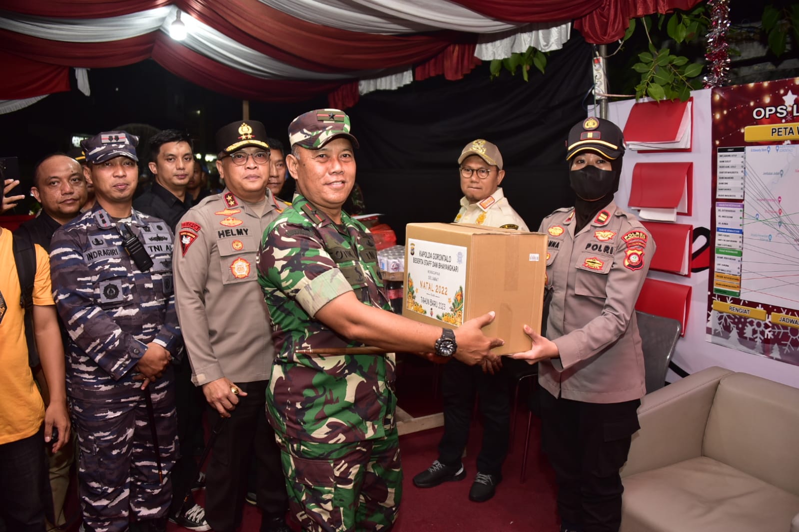 Dalam kegiatan peninjauan Pos Pengamanan Danrem 133/Nani Wartabone bersama Forkopimda provinsi Gorontalo juga membagikan bingkisan kepada anggota TNI-Polri yang jaga di Pos Pengamanan.