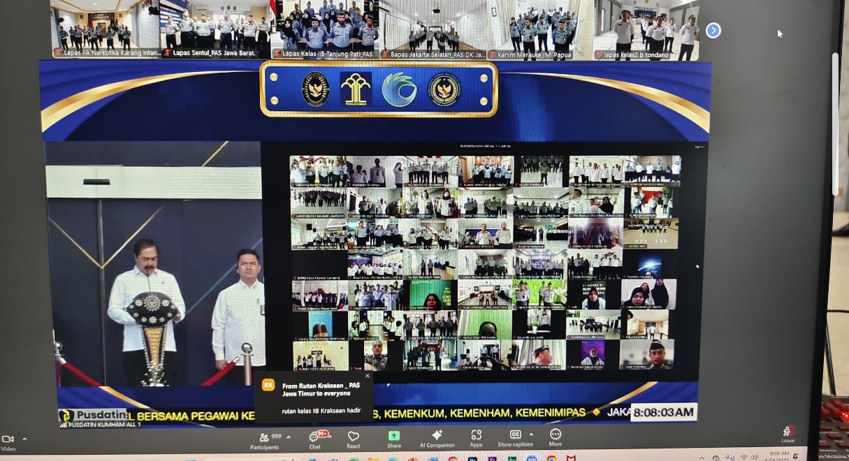 Lapas Narkotika Kelas IIA Karang Intan turut mengikuti pelaksanaan Apel Pegawai Keluarga Besar Kementerian Koordinator Bidang Hukum, Hak Asasi Manusia, Imigrasi dan Pemasyarakatan, Senin (16/6). Kegiatan yang digelar serentak ini merupakan bagian dari penguatan integrasi dan konsolidasi dalam masa transisi kementerian.
