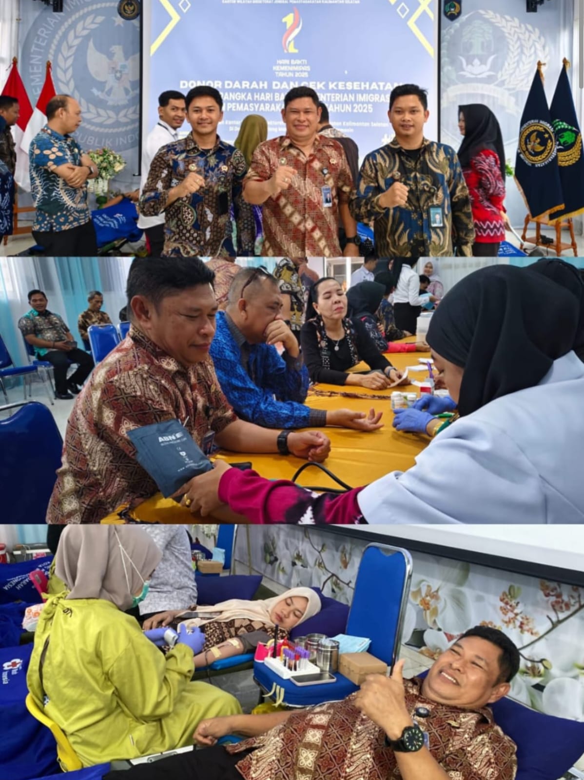Kepala Lapas Kelas IIA Banjarmasin, Akhmad Herriansyah, bersama Petugas Humas Lapas Banjarmasin mengikuti kegiatan Donor Darah dan Pengecekan Kesehatan dalam rangka Hari Bakti Kementerian Imigrasi dan Pemasyarakatan Tahun 2025 pada Kamis (13/11). Kegiatan dilaksanakan di lingkungan Kantor Wilayah Direktorat Jenderal Pemasyarakatan Kalimantan Selatan.