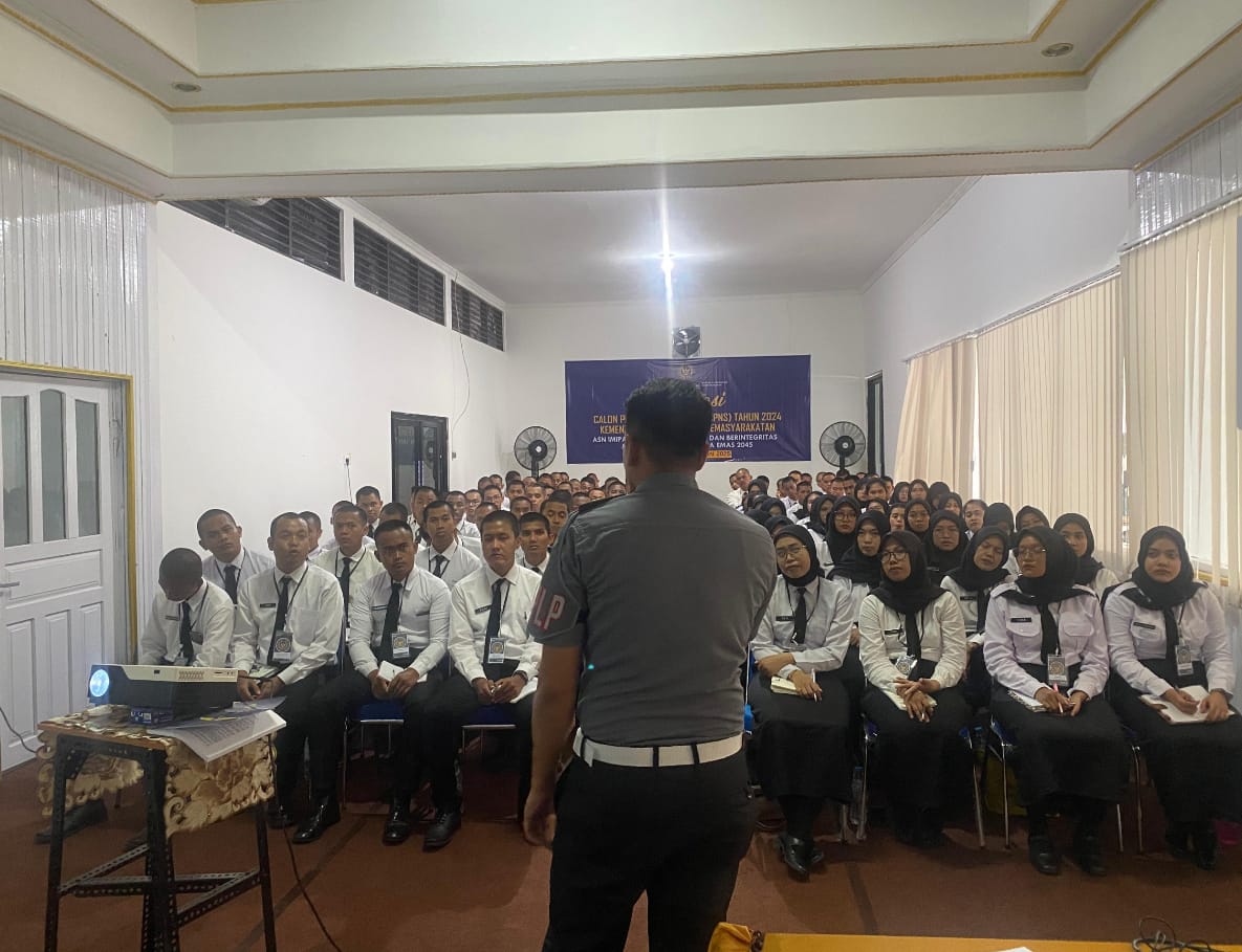 Kepala Kesatuan Pengamanan Lembaga Pemasyarakatan (KPLP) Lapas Narkotika Kelas IIA Karang Intan, Rizki Akbar, memberikan pembekalan kepada Calon Pegawai Negeri Sipil (CPNS) Kemenimipas Tahun 2024 terkait teknik penggeledahan di Lapas/Rutan. Kegiatan ini berlangsung di Aula Kantor Wilayah Direktorat Jenderal Pemasyarakatan Kalimantan Selatan, Senin (16/6).