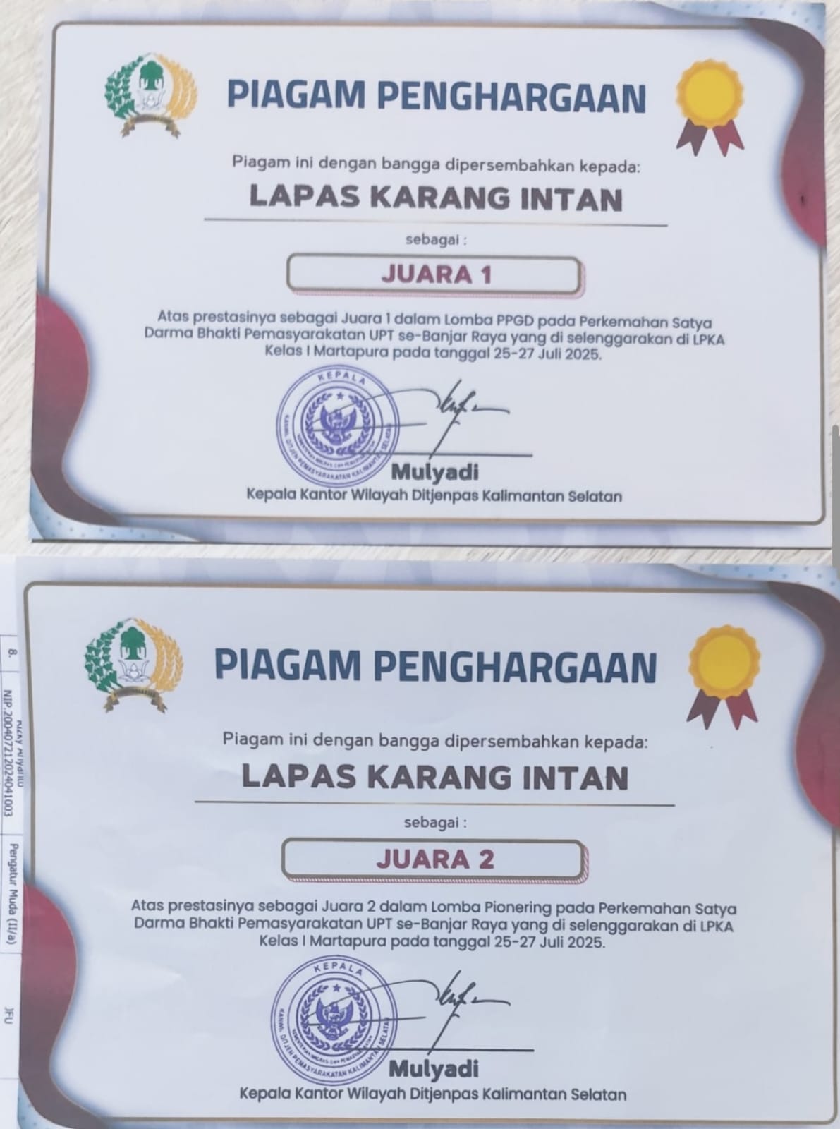 Lembaga Pemasyarakatan (Lapas) Narkotika Kelas IIA Karang Intan menerima piagam penghargaan atas prestasi membanggakan yang diraih dalam kegiatan perkemahan Satya Dharma Bhakti Pemasyarakatan dan Peringatan Hari Anak Nasional Tahun 2025. Piagam diserahkan secara resmi oleh jajaran Kantor Wilayah Direktorat Jenderal Pemasyarakatan Kalimantan Selatan di Lembaga Pembinaan Khusus Anak (LPKA) Kelas I Martapura, Sabtu (26/7).