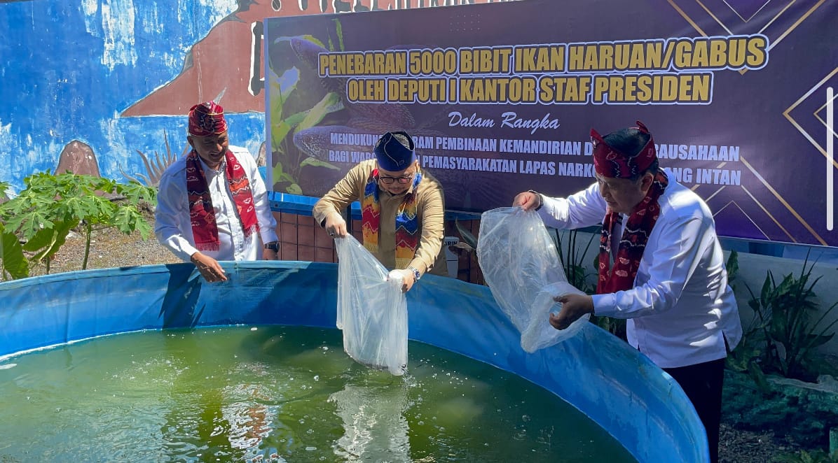 Rangkaian kunjungan kerja Tim Kedeputian I Kantor Staf Presiden Republik Indonesia (KSP RI) ke Lembaga Pemasyarakatan (Lapas) Narkotika Kelas IIA Karang Intan berlanjut dengan kegiatan penebaran 5.000 bibit ikan haruan/gabus, Selasa (1/7). Kegiatan ini menjadi bentuk nyata dukungan terhadap program kemandirian berbasis perikanan yang dikembangkan oleh Lapas sebagai bagian dari pembinaan warga binaan pemasyarakatan (WBP).