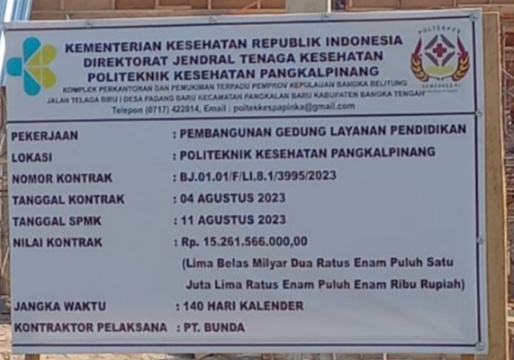 Seperti diketahui Pekerjaan Pembangunan Gedung Poltekes Pangkalpinang dikerjakan Oleh PT Bunda dengan nilai kontrak lebih dari 15 Miliar Rupiah, dimana pekerjaan inipun telah melewati batas kontrak. Pekerjaan yang berkontrak dari 04 Agustus 2023 dengan masa pekerjaan 140 Hari Kalender harusnya berakhir pada 21 Desember 2023, namun hingga kini pekerjaan belum kelar.
