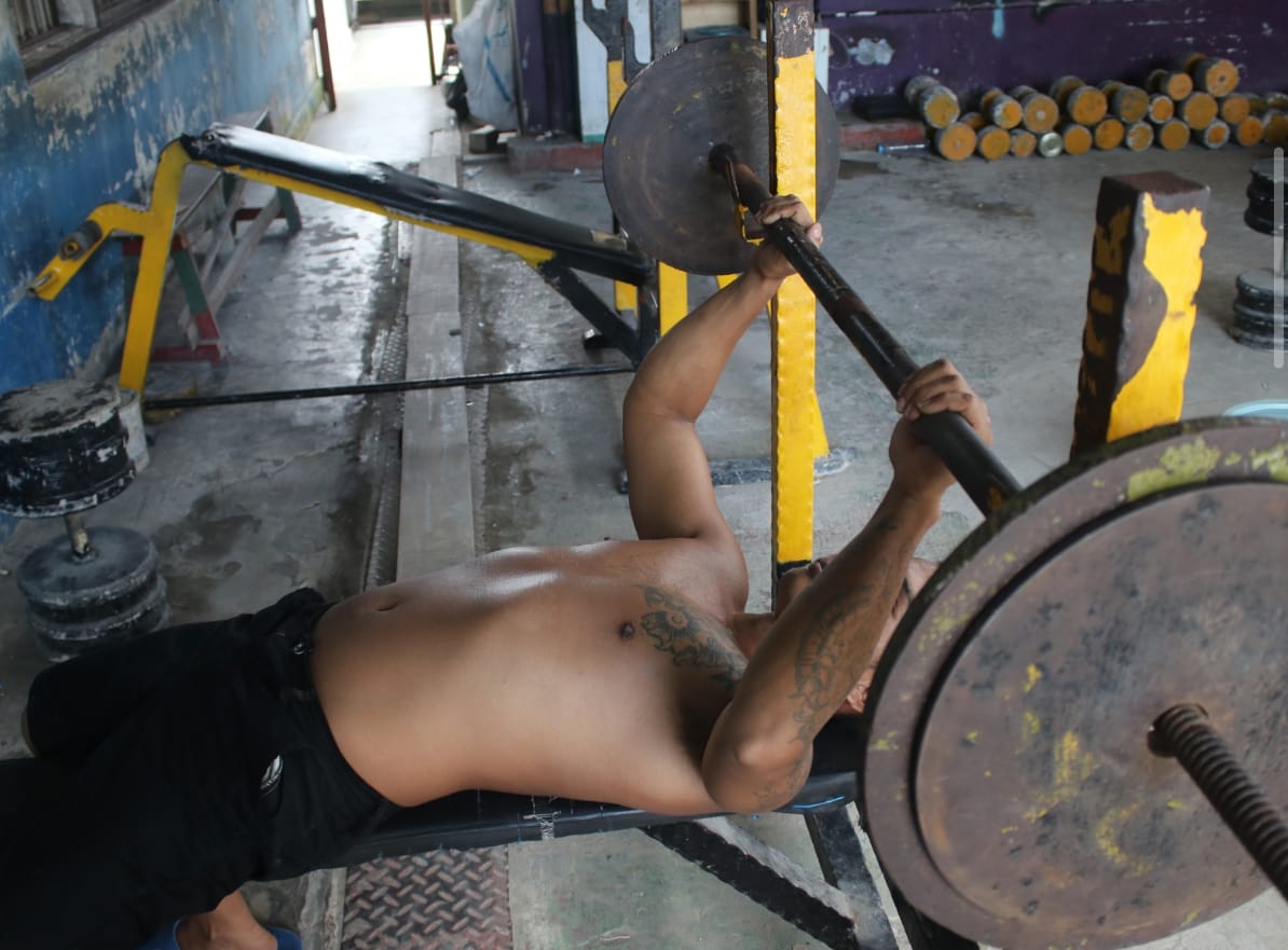 Salah satu warga binaan terlihat serius menjalani sesi latihan angkat beban menggunakan alat rakitan yang telah dimodifikasi secara mandiri. Dengan peralatan sederhana namun fungsional, para warga binaan tetap dapat melakukan berbagai jenis latihan otot seperti latihan pull down, bench press, dan squat.